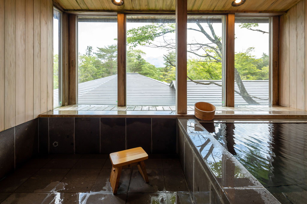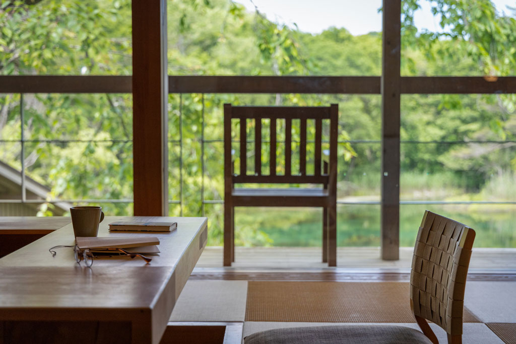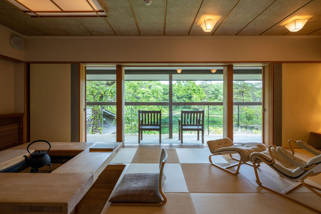 一番人気の離れは、1室のみのプライベート空間。 囲炉裏のある16帖の和室とバルコニーからは、 四季折々の森とエメラルドグリーンの沼が見渡せます。 離れ専用の源泉かけ流し温泉も、お好きな時にゆったりと。